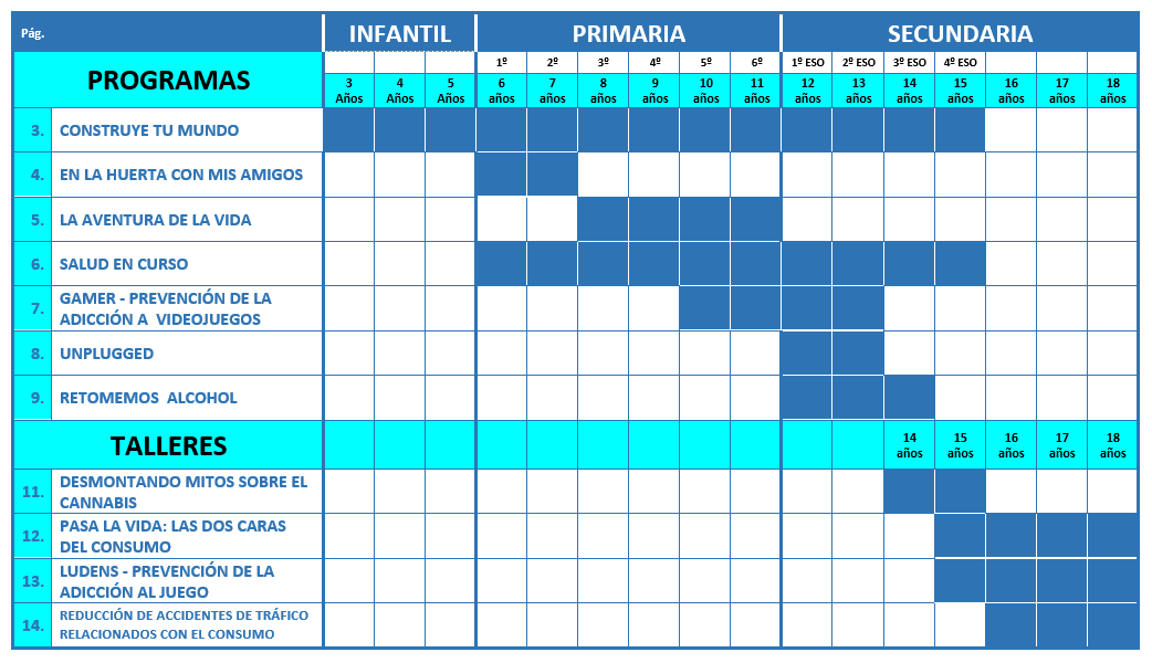 Relación de programas y talleres disponibles durante el curso 2025-26, con información básica de cada uno.