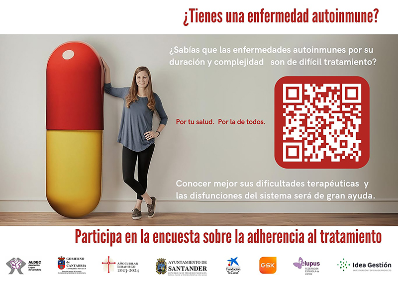 Esta encuesta ha contado con el apoyo de la Dirección General de Farmacia, Humanización y Coordinación Sociosanitaria de la Consejería de Salud de Cantabria, a través de una subvención específica para este proyecto. El cuestionario está compuesto por una veintena de preguntas que estudian en qué medida el medio social, económico o cultural influye en el grado de cumplimiento farmacológico en el colectivo de enfermos autoinmunes. El cartel informativo del proyecto incluye un QR para facilitar la respuesta desde dispositivos móviles.
